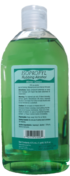 Available as Isopropyl Rubbing Alcohol 70 and as Isopropyl Rubbing Alcohol Wintergreen that incorporates Methyl Salicylate as an added pain reliever.Used for rubbing, and massaging joints and muscles, and as an external stimulant. For the preparation of the skin prior to injection, for first aid to decrease germs in minor cuts, scrapes, and burns